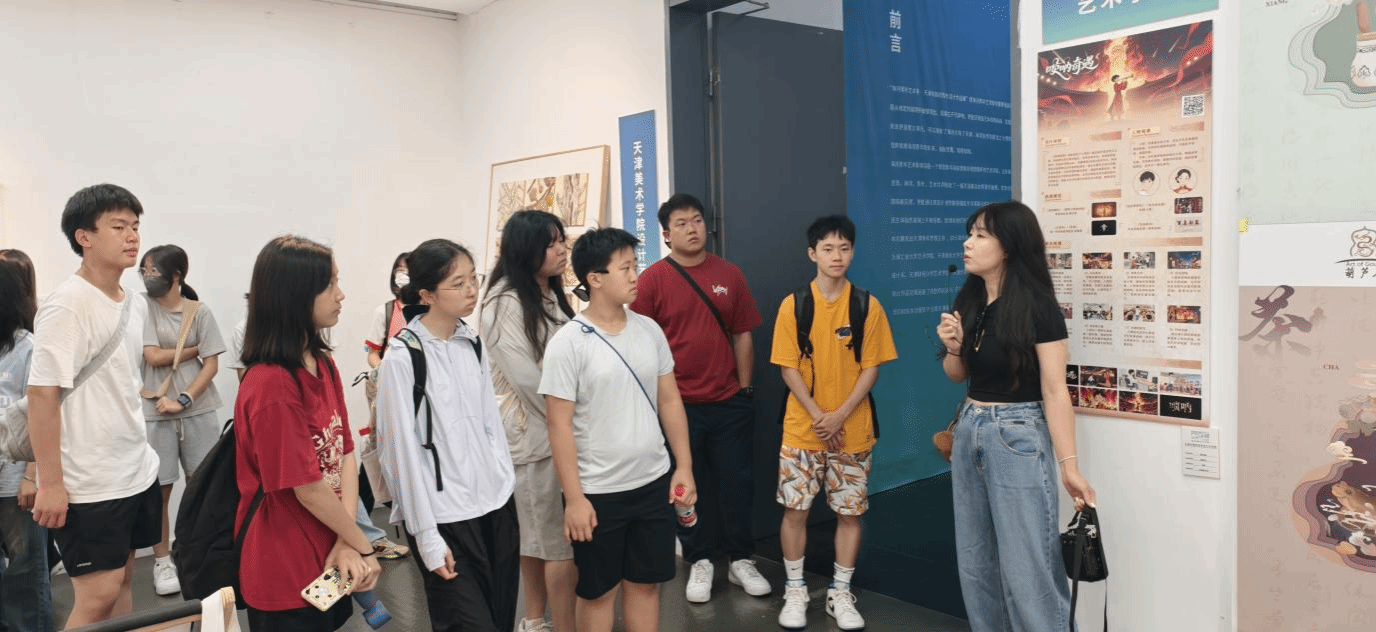 随后,学生们参观了《海河青年艺术季・天津市高校青年设计作品展》,设计艺术学院青年教师,视觉传达设计系副主任刘晓初进行导览。刘老师带领大家观看了来自天津市各高校青年设计师们的作品,为同学们详细介绍了我校视觉传达设计、产品设计、工艺美术等专业的情况。徜徉在形式纷呈的艺术作品中,同学们不仅感受到内地新生代青年设计师们的锐意创新,更通过作品触摸到天津这座城市的勃勃生机以及多元、包容、厚重的文化风貌。